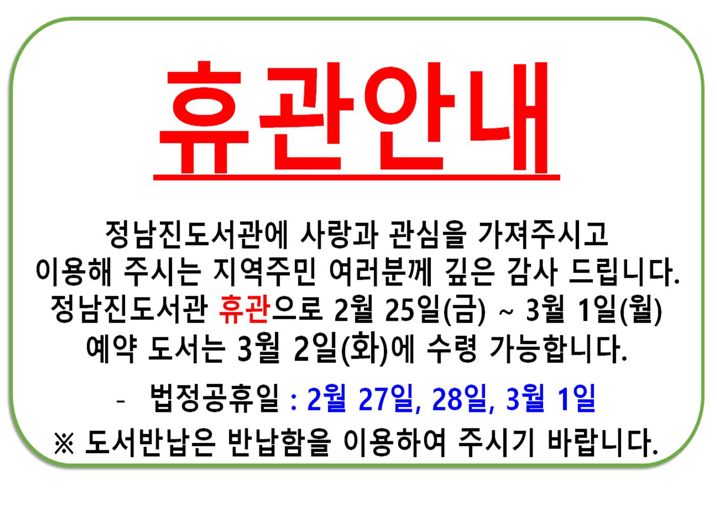 공지사항 정남진도서관 휴관안내(2월 27일 ~ 3월1일) 조회수 : 1020 첨부파일 휴관안내001.jpg (144.01 KB) 정남진도서관 휴관으로 2월 26일(금) ~ 3월 1일(월) 예약도서는 3월 2일(화)에 수령하실 수 있습니다.